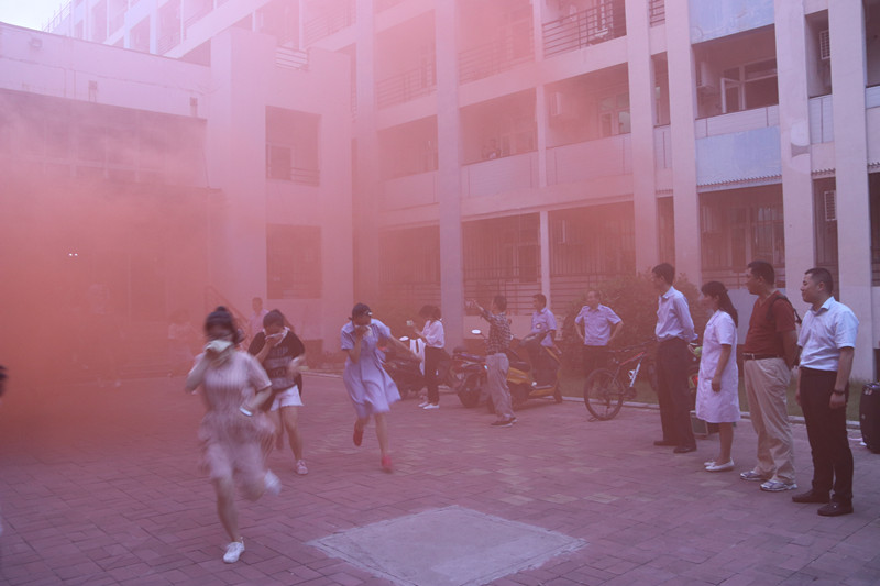 在学生宿舍8号楼,随着韩副校长一声“开始演练”的命令,宿舍楼内模拟电线短路引发火情,全楼灯灭,楼道浓烟滚滚,楼内学生在工作人员的引导下,用湿毛巾捂住口鼻,迅速弯腰、有序、安全地从宿舍撤离。参演师生在规定时间内按预定的疏散路线迅速撤离到安全地点。清点人数后,得知有1名学生受伤仍在楼内,现场总指挥立即向救援队发出救援指令,救援队迅速展开搜索,并将受伤学生安全救出,在医护人员的帮助下,用担架抬往医疗救护点救治,演练正式结束。此次演练活动按预案顺利完成,取得了预期效果。